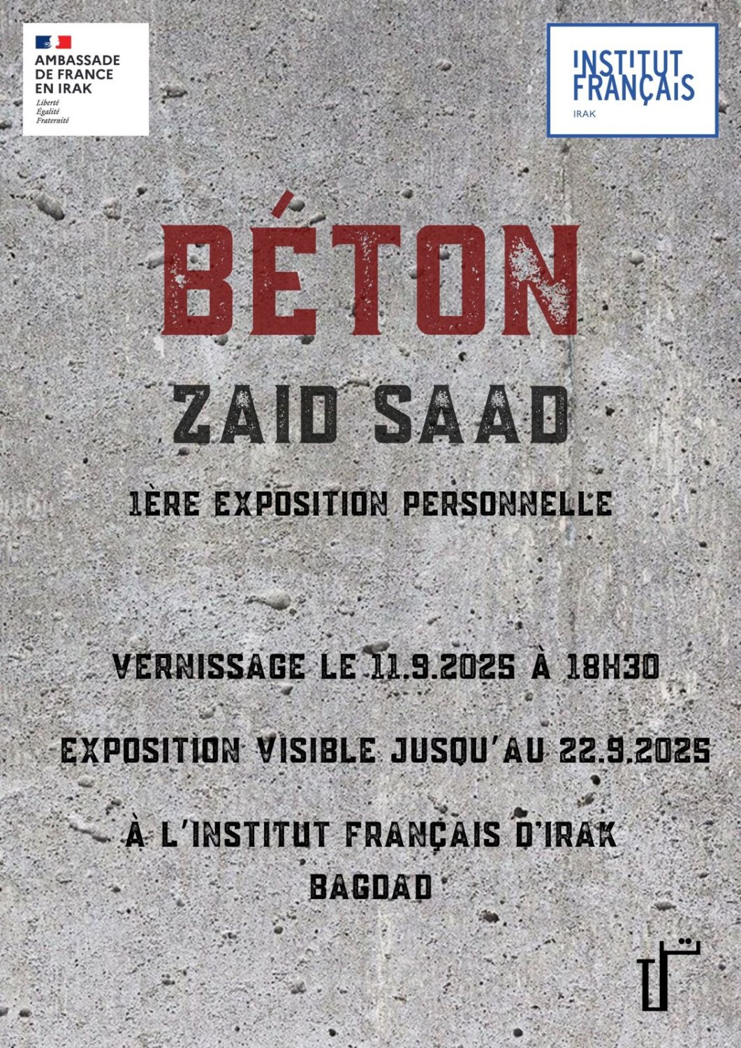 الإنسانية اهم من جمالية الاعمال الفنية. من هذا المنطلق يقدم الفنان زيد سعد معرضه الشخصي الأول كونكريت الذي يركز على القضايا الإنسانية بهدف توثيق و تسليط الضوء على الانتهاكات التي يتعرض لها الانسان في القرن الواحد و العشرون، الكونكريت هو العنصر الأساسي المستخدم في المعرض ليرمز الى القسوة ، ثقل الوقت، الحزن، الجسد، والظلم الذي يتعرض له الانسان.